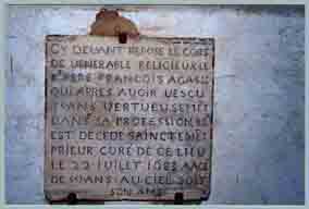 Inscription : CY DEVANT REPOSE LE COR[p]S / DE VENERABLE RELIGIEUX LE / R[évéren]d PERE FRANCOIS AGASSE / QUI APRES AVOIR VESCU / 35 ANS VERTUEUSEME[n]T / DANS SA PROFESSION RE[ligieu]se / EST DECEDE SAINCTEME[n]T / PRIEUR CURE DE CE LIEU / LE 22 JUILLET 1683, AAGE / DE 50 ANS. AU CIEL SOIT / SON AME. |