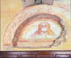 | Ensemble des peintures murales du mur sud : peintures romanes à dominante ocre-rouge réparties sur deux registres superposés et décor de la fenêtre percé postérieurement (faux appareillage et colonnettes supportant un arc fait de claveaux aux coloris alternés). fin XIe - début XIIe (scènes sur deux registres) et XIIIe (décor de la fenêtre)