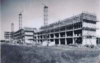 La Basse-Normandie, et particulièrement la Manche, se démarque de bien d’autres régions par l’importance de son patrimoine Reconstruction. L’attribution du label national « Patrimoine XXe » et la protection au titre des Monuments historiques, concernant un ensemble d’édifices et leur décor, entre 2004 et 2010, ont marqué une étape dans la reconnaissance de l’intérêt patrimonial de la Reconstruction. L’hôpital mémorial France-Etats-Unis, de Saint-Lô et sa mosaïque de Fernand Léger, par exemple, classés en 2008, est le premier et seul édifice hospitalier français du XXe siècle à avoir fait l’objet d’une telle mesure. Cet édifice est représentatif de ces grands chantiers de reconstruction qui ont contribué à une renaissance des arts pendant une vingtaine d’années dans la Manche. Ill. Construction de l'hôpital mémorial France-Etats-Unis de Saint-Lô. Paul Nelson, architecte. Coll. CH mémorial Saint-Lô. |